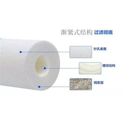 先进的渐紧式结构制造工艺;食品级纤维滤芯; 精度1微米,杂质截留率更高,净水流量大。高孔隙率,高截留率,有效提升容污力,大大节省了由于普通滤芯堵塞,而需要时常更换的费用(滤材由外向内逐层渗透过滤)